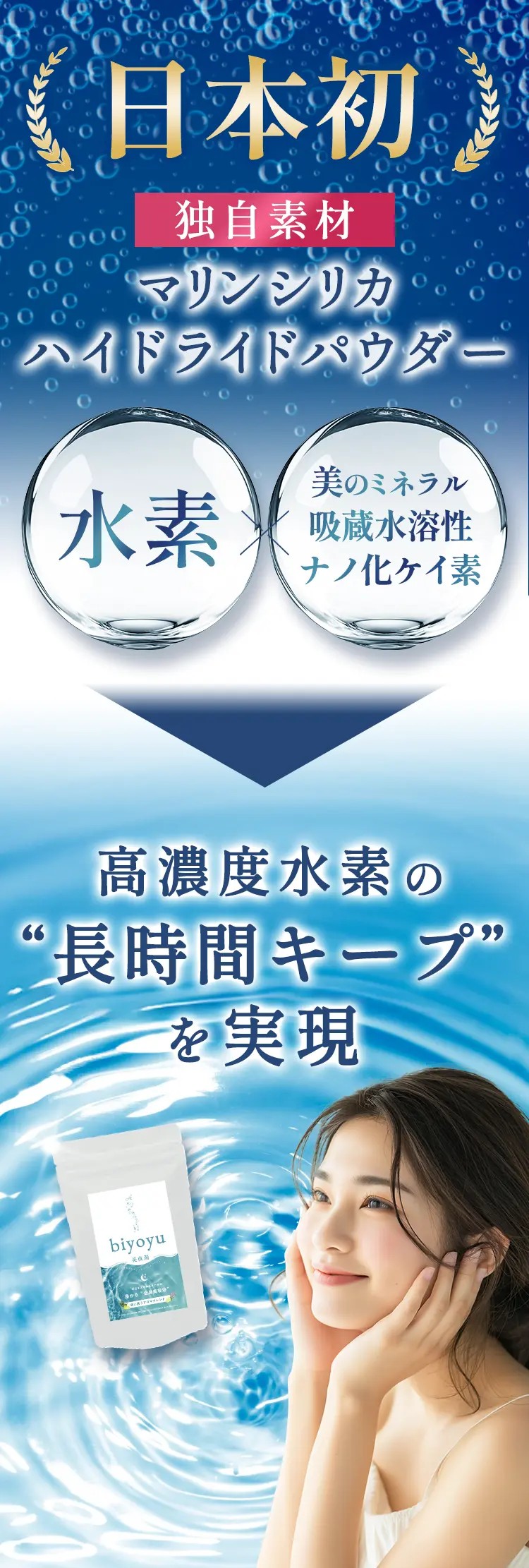 日本初・独占供給の水素原料「マリンシリカハイドライドパウダー」を配合した入浴料「biyoyu-美夜湯-」。