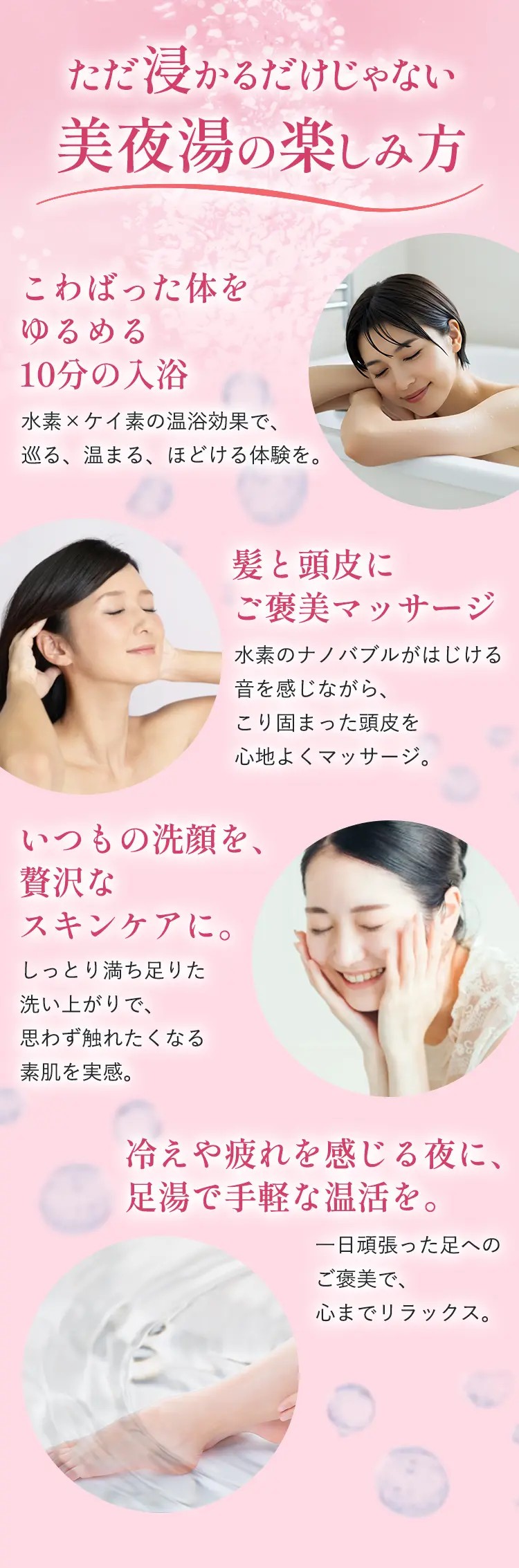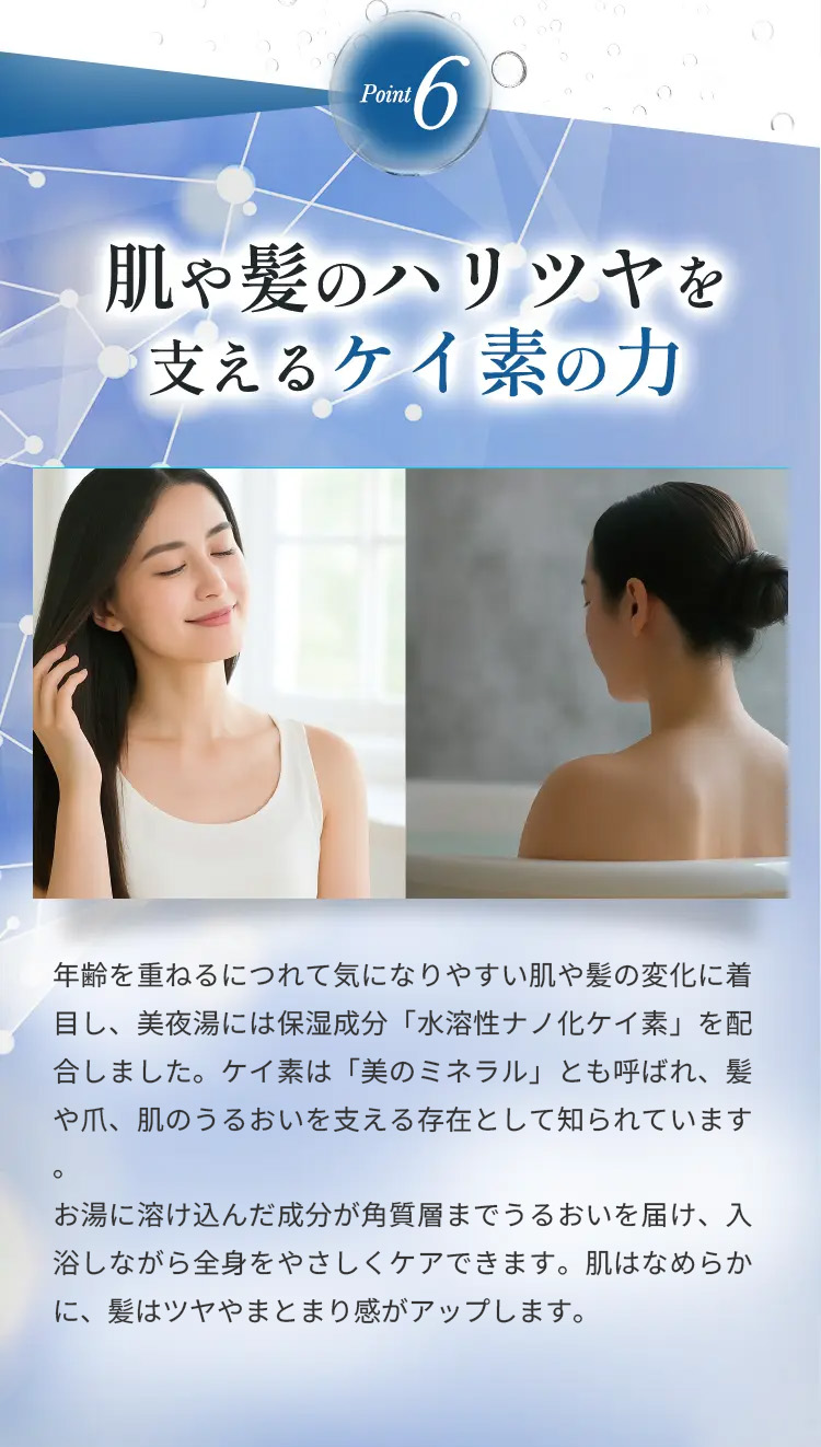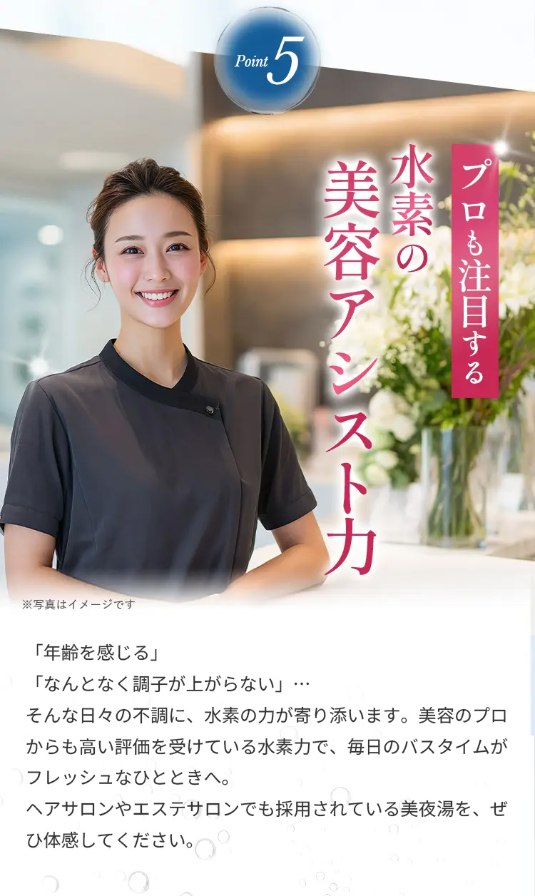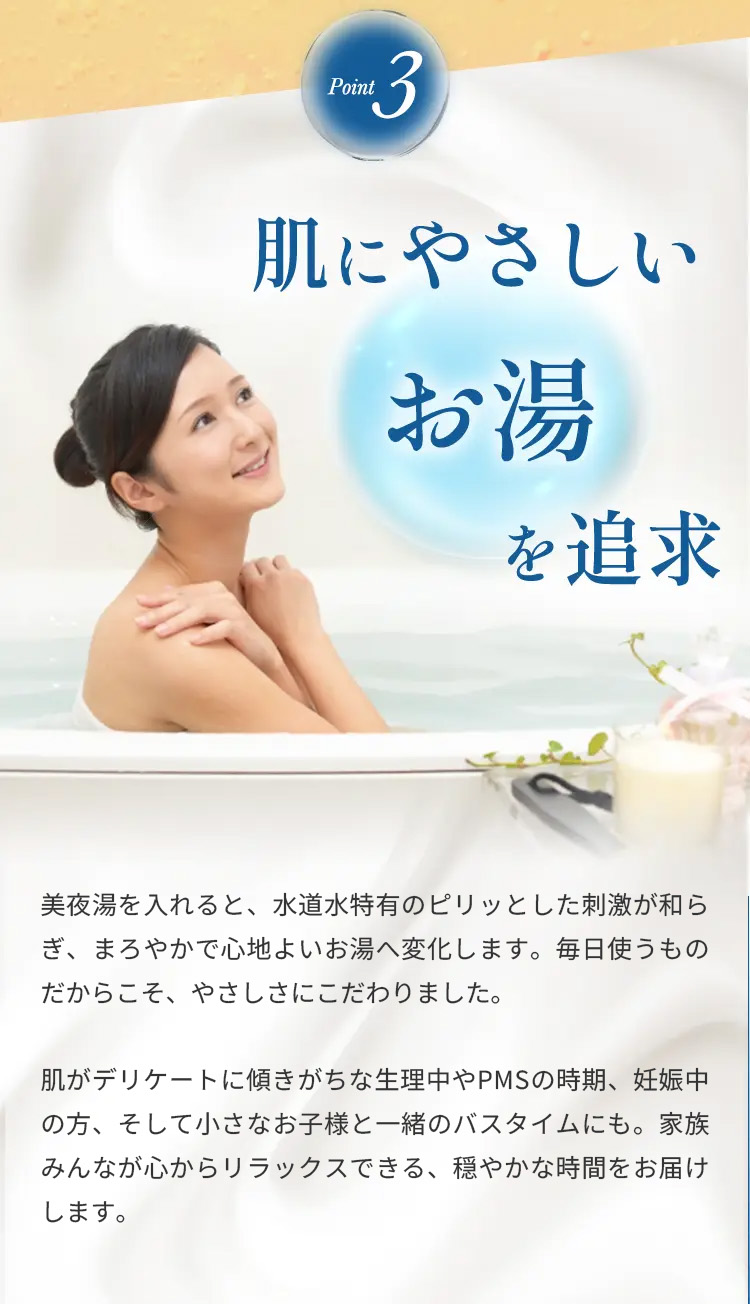 湯ざわりがやわらかくなり、入浴後はしっとりなめらかな肌へ。水素との相乗効果で贅沢なバスタイムを叶えます。