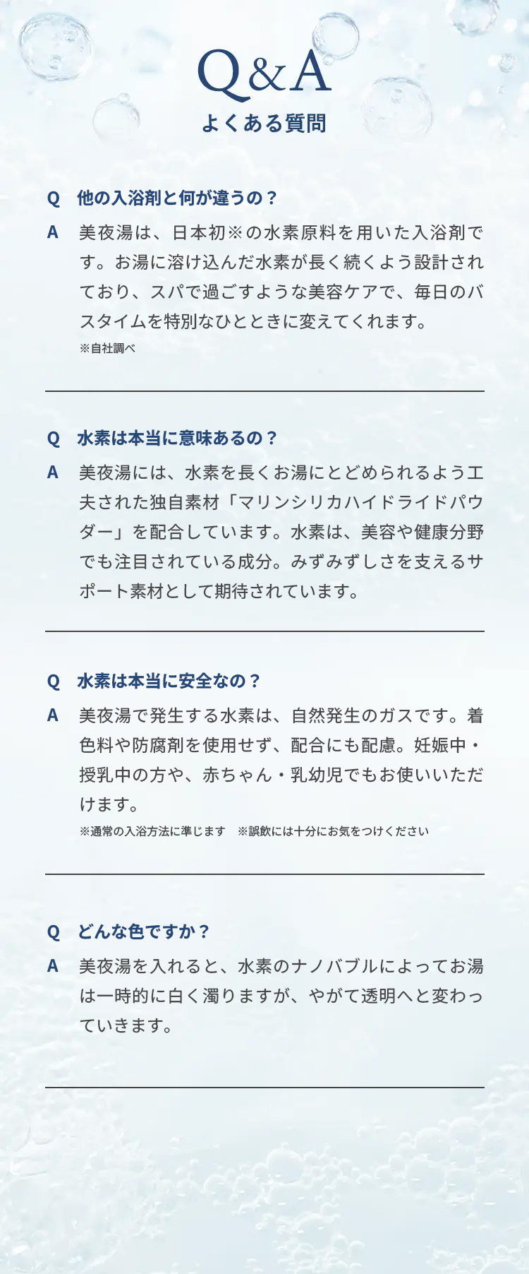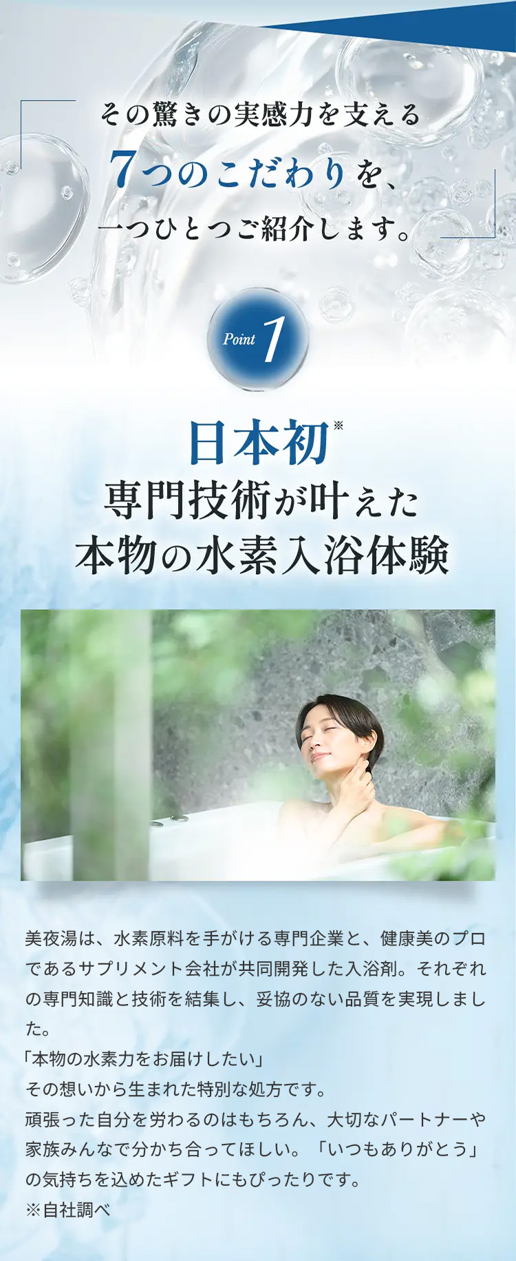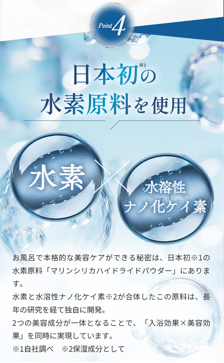お湯に溶かすと瞬時に水素が発生し、さらに長時間持続。なめらかなお湯が全身をやさしく包み込みます。