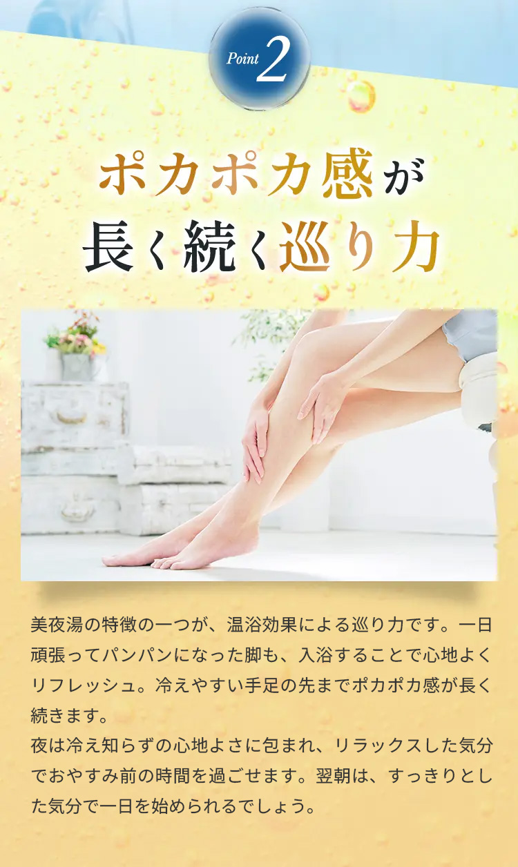 入浴による温浴効果で血流を促し、1日の疲れをじんわりとほぐしながら、心地よいリラックスタイムへ。
