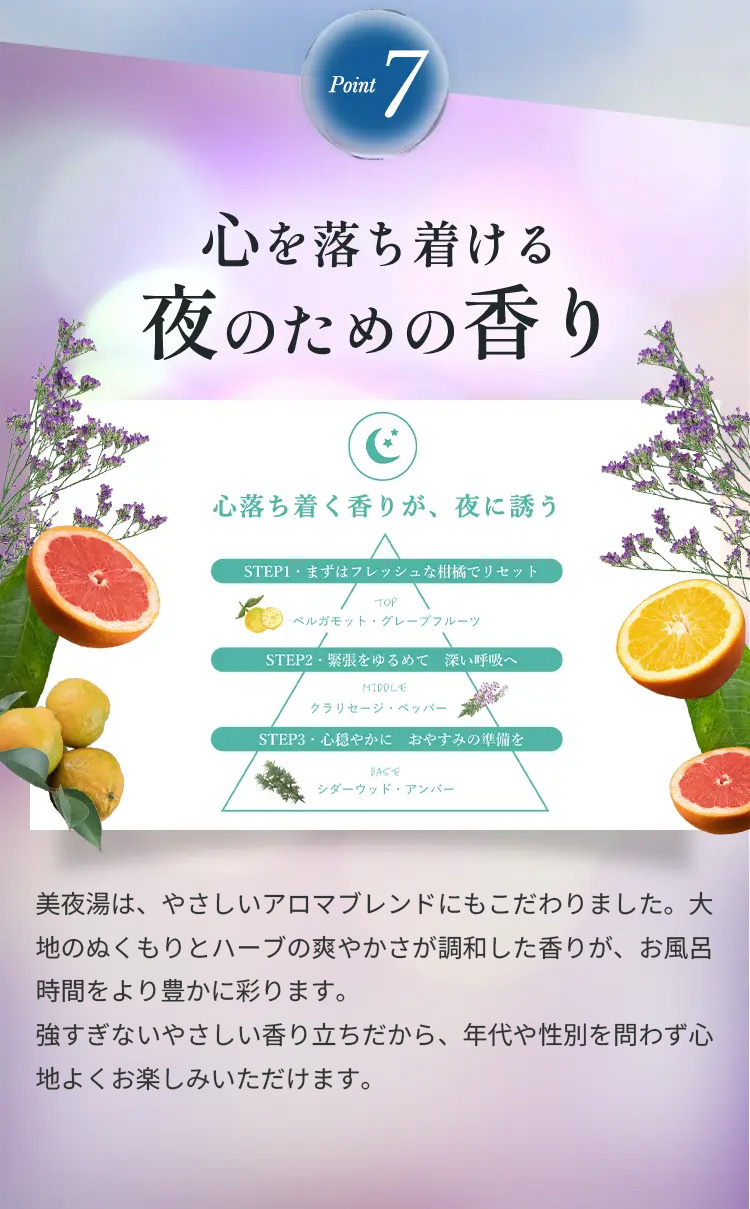 深い呼吸へと導き、心穏やかな眠りの準備をサポートします。